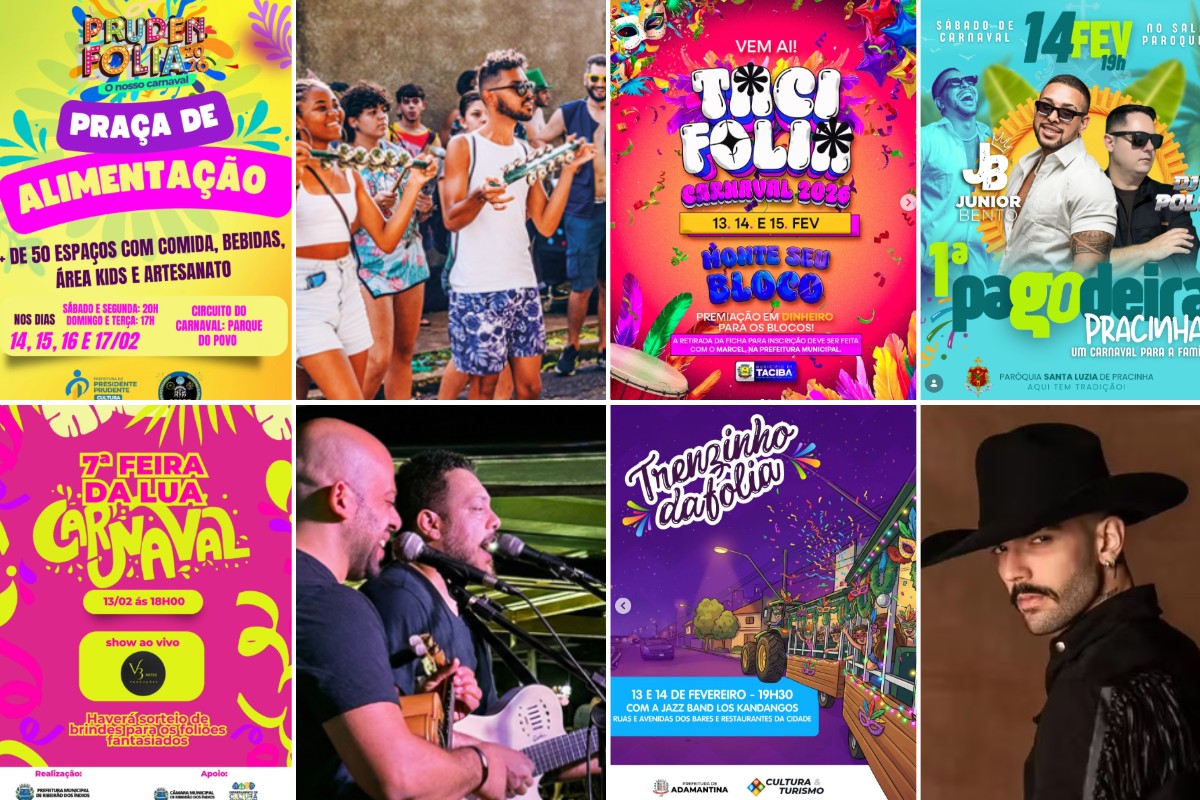 - Evento: A programação em Presidente Prudente inclui shows todos os dias, além de praça de alimentação e feira de artesanato, no Parque do Povo, entre 14 e 17 de fevereiro.